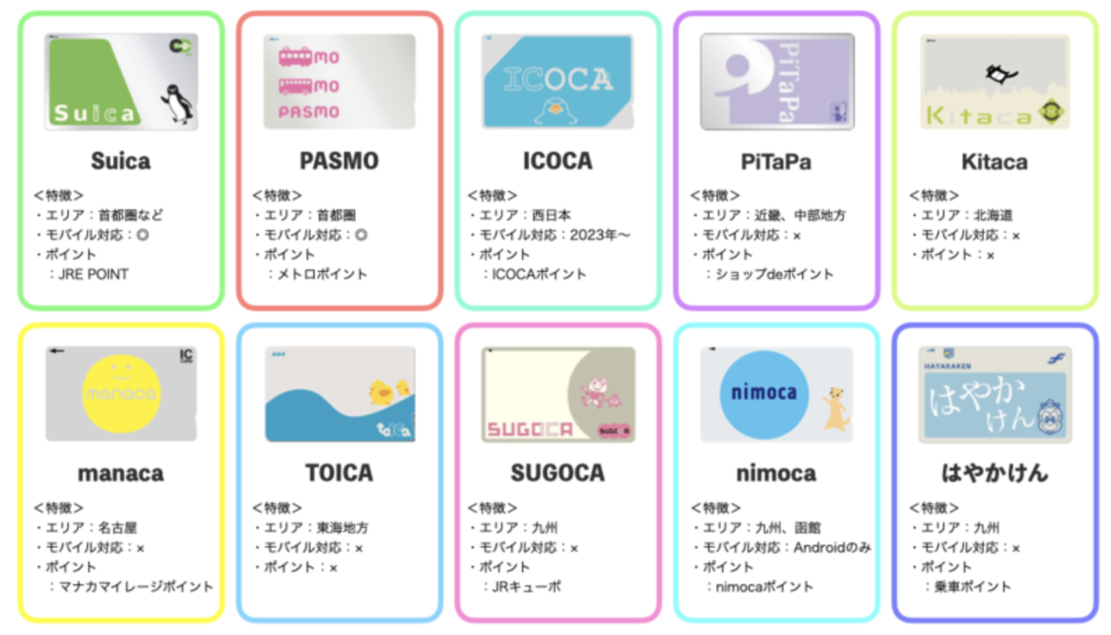 | 모바일 지원 | 모바일 Suica (iOS/Android) | 모바일 PASMO (iOS/Android) | 모바일 ICOCA (2023년 이후 iOS/Android 지원) |
