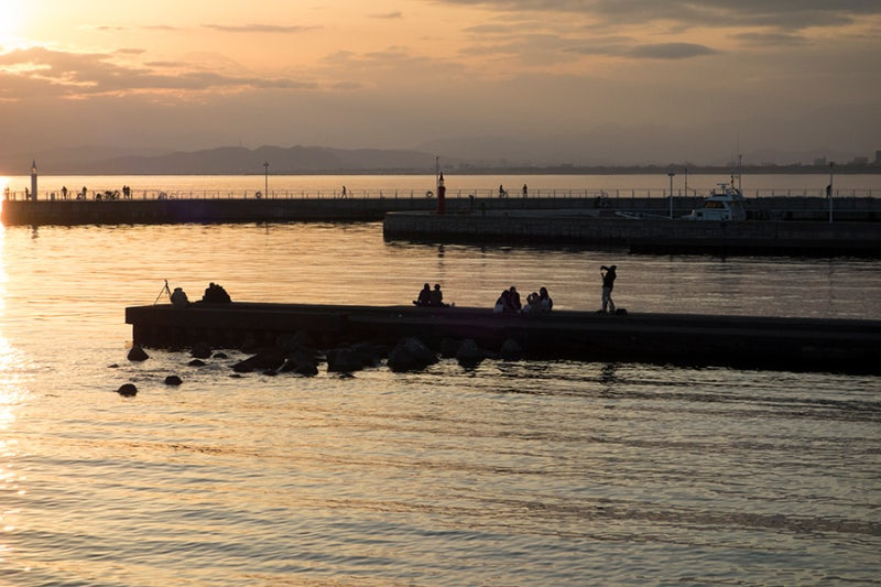 바다 위로 떠오르는 태양과 에노시마 섬, 날씨가 좋으면 후지산까지 볼 수 있습니다.